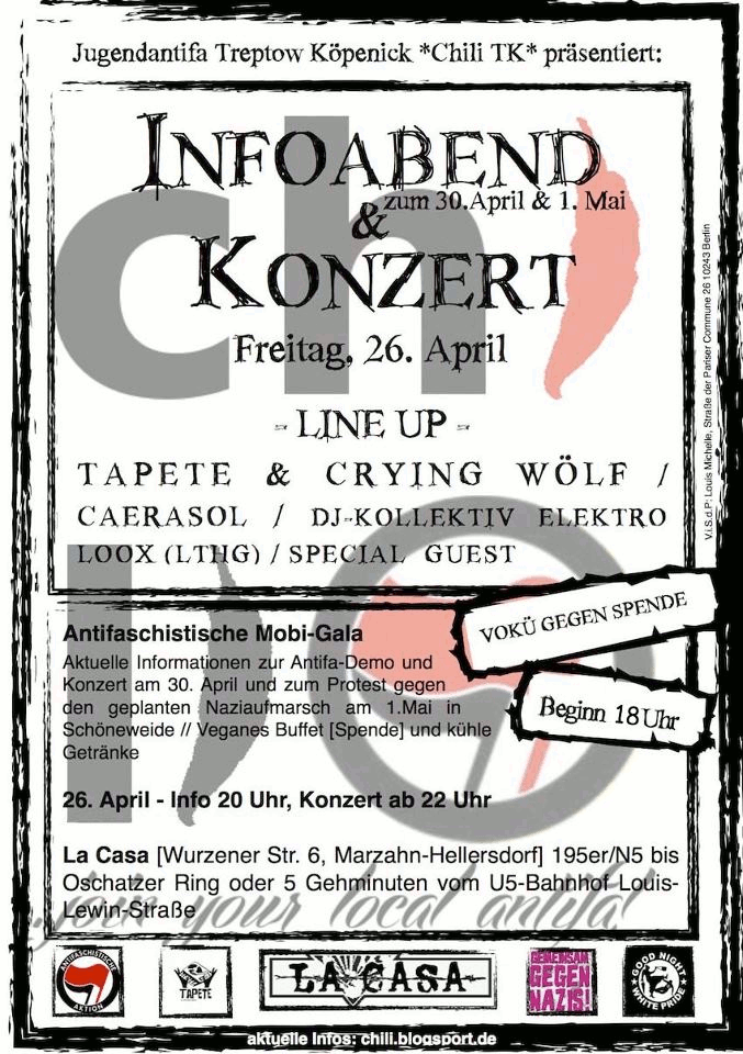 Am 30. April 2013 findet in Schöneweide ein “Gemeinsam gegen Nazis”-Konzert statt. Einen Tag später versuchen die Nazis am 1. Mai einen Naziaufmarsch durchzuführen. Doch warum findet als dies ausgerechnet in Schöneweide statt? Mit der Nazikneipe „Henker“ und dem Militaryladen „Hexogen“ haben sich die Nazis in Schöneweide eine Infrastruktur geschaffen, die den Kiez attraktiv für die gesamte Berliner Naziszene macht. So gibt es inzwischen in der Gegend nicht nur Nazi-WGs, Übergriffe, Propaganda und regelmäßige Veranstaltungen, auch siedeln sich immer weitere Nazis mit Geschäften und Kneipen hier an. Dass die Anwohner*innen vielfach die Neonazi-Nachbar*innen nicht als Problem wahrnehmen, verschlimmert die Situation zusätzlich. Ein Vertreter des Bündnisses “Gemeinsam gegen Nazis” wird uns etwas über die Situation vor Ort, das Konzert sowie darüber, was ihr am 1. Mai gegen den Naziaufmarsch unternehmen könnt, erzählen.