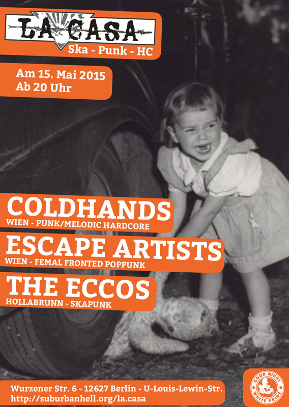 Gespeichert von jan-maron am 22. April 2015 - 22:07 Datum: Freitag, 15. Mai 2015, 20:00 UhrInternational geht es auch dieses Abend zu. diesmal mit Gästen aus Östereich. Coldhands (Punk/Melodic HC - Wien) Escape Artists (Femal Fronted Poppunk - Wien) The Eccos (SkaPunk - Hollabrunn) No comment!