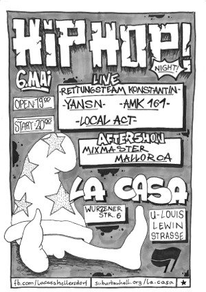 Am sechsten Mai wollen wir mit euch in der Oase der Plattenbaulandschaft Hellersdorfs, dem LaCasa, zu feinstem Hip-Hop tanzen. Wir freuen uns, euch qualitativ ansprechende Acts bieten zu können, die teils gute Freunde des Hauses sind und es danach sicherlich werden. Für ein linke Subkultur, auch außerhalb des S-Bahn Rings!